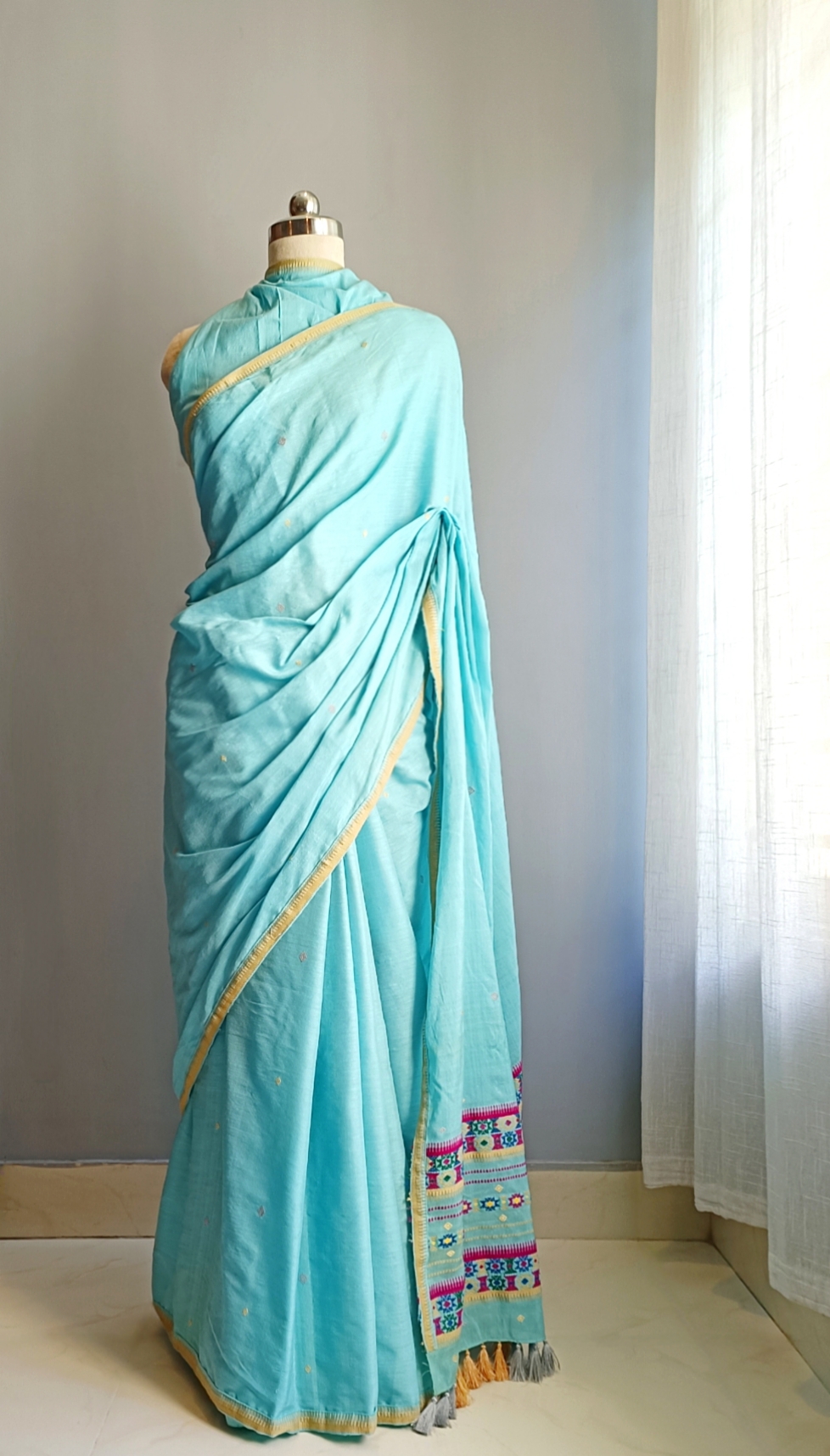 Description: A stunning handwoven silk blend saree in a serene powder blue shade, featuring intricate geometric Dimasa patterns on the pallu. The body is adorned with delicate butas throughout, while the border is finished with a refined lace and playful tassels.